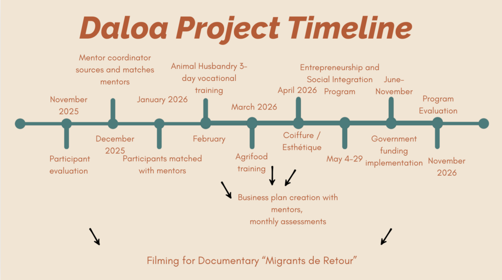 The Entrepreneurship and Social Reintegration Program in Daloa, Ivory Coast is a year-long program that aims to support the reintegration of 26 returned migrants, aged 19 to 50. These migrants are returning from countries like Tunisia, Morocco and Kuwait, after harrowing migration experiences. This program will provide them with the necessary skills to build sustainable local businesses, psychosocial support, and provide them with crucial information about immigration so that they can make informed decisions about migration and become examples for others in their community thinking of embarking on clandestine migration journeys. Developed in collaboration with Fulbright France alumna and attorney M’Ballou Yacine SANOGHO, social worker Diane CABA, the Ministry of Education of Abidjan and Haut-Sassandra, l’OFII, and organizations in West Africa like RVR (Ivory Coast), The Okwelians (Cameroon), and ASI (Guinea) this pilot program will serve as an example of how to support returned migrants that can be reproduced across the region. We will also be filming a documentary, “Migrants de Retour”, highlighting participant stories to raise awareness about the lived realities of those returning home.
